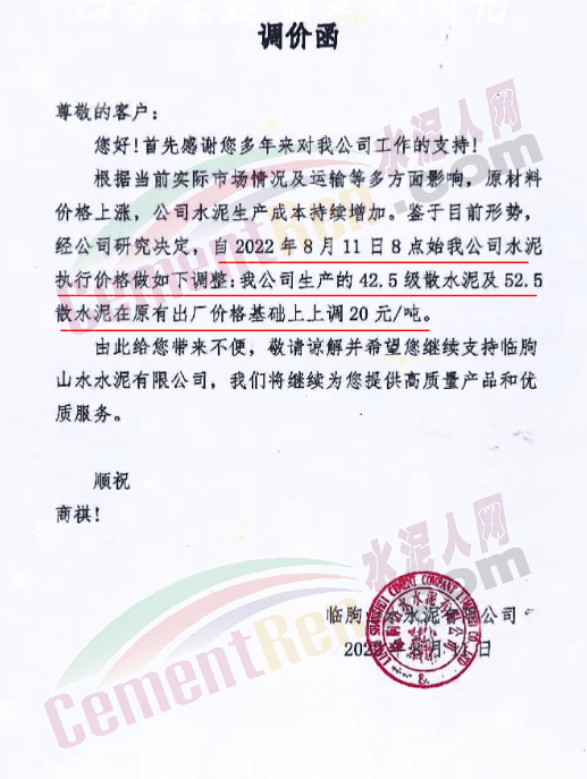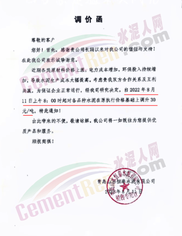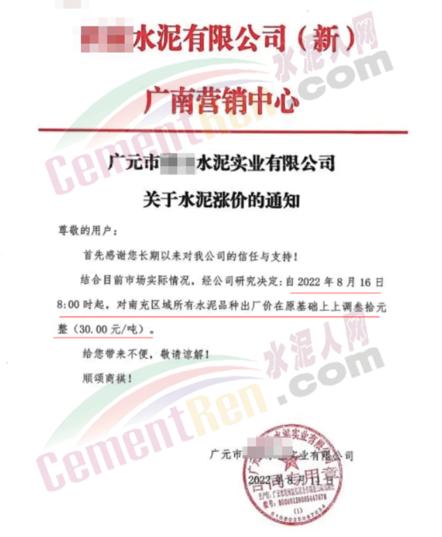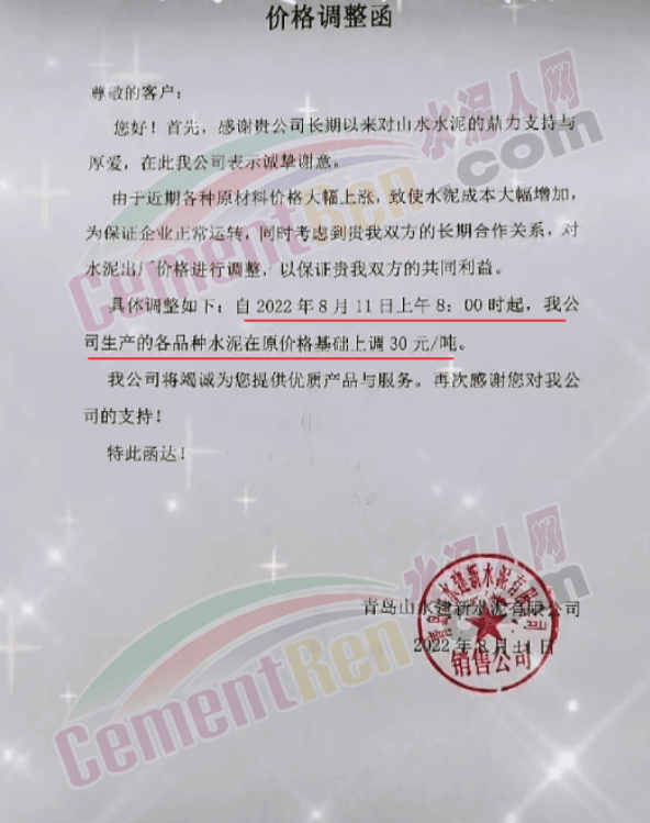山東山水水泥建新水泥有限公司通知,自8月11日上午8時起,公司各品種水泥在原價基礎(chǔ)上上調(diào)30元/噸。