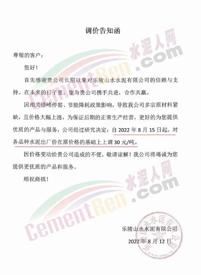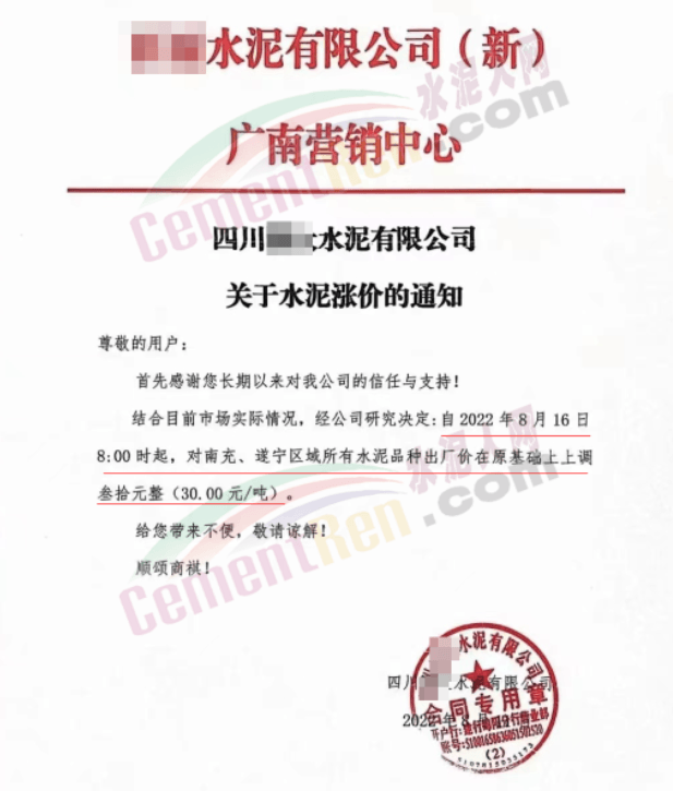 四川億鑫聯(lián)水泥有限公司通知,因受限電、錯峰生產(chǎn)要求及原材料成本居高等影響,經(jīng)公司研究決定,自8月16日上午7時起,對公司各產(chǎn)品價格上 調(diào)30元/噸。