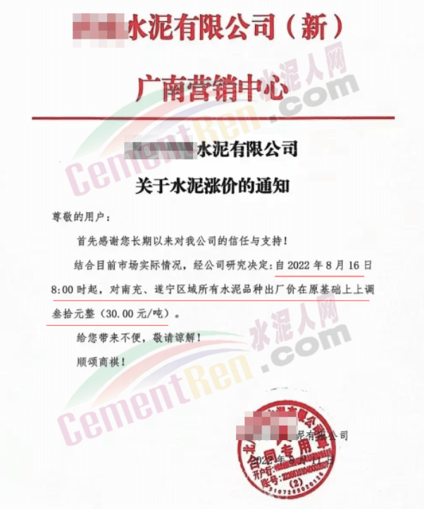 同期,四川多家水泥企業(yè)通知,結(jié)合目前市場實際情況,自8月16日起,對南充、遂寧區(qū)域所有水泥品種出廠價上調(diào)30元/噸。