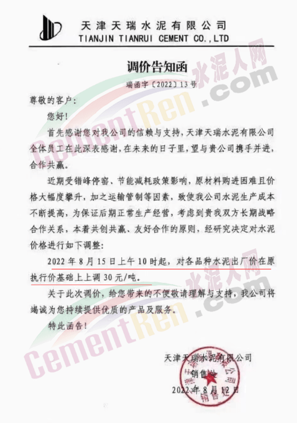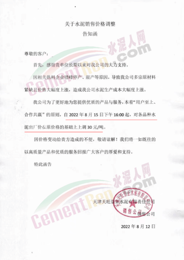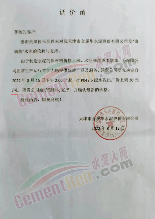天津市金晟華水泥股份有限公司通知,由于制造水泥的原材料價格上漲,水泥制造成本增加,為保障公司正常運行,經(jīng)公司研究決定自8月15日下午2時起,對P.O42.5水泥出廠價上調(diào)30元/噸。