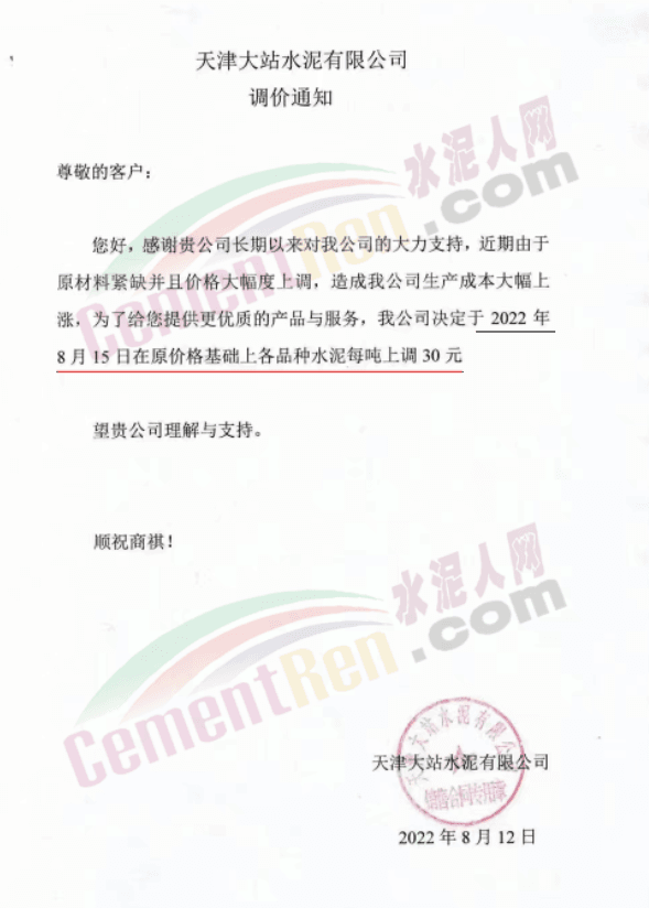 天津大站水泥有限公司通知,由于原材料緊缺并且價格大幅度上 調(diào),造成公司生產(chǎn)成本大幅上漲,公司決定于8月15日起在各品種水泥價格原價基礎(chǔ)上上調(diào)30元/噸。