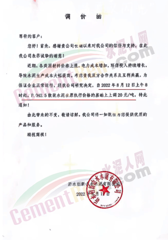 沂水創(chuàng)新山水水泥有限公司通知,近期各類原材料價格上漲,電力成本增加,環(huán)保投入持續(xù)增長,導(dǎo)致水泥生產(chǎn)成本大幅提高,經(jīng)公司研究決定,自8月12日早午8時起,P.O42.5散裝水泥在原價基礎(chǔ)上上調(diào)20元/噸。
