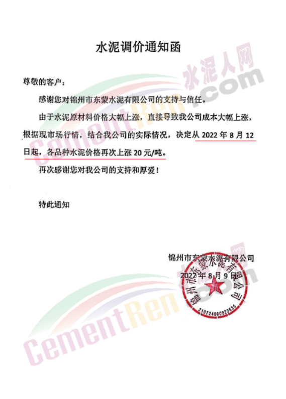 遼寧錦州市東蒙水泥有限公司通知,由于水泥原材料價格大幅上漲,直接導(dǎo)致公司成本大幅上漲,根據(jù)現(xiàn)在的市場行情 ,結(jié)合公司的實際情況,決定從8月12日起,各品種水泥價格再次上漲20元/噸。