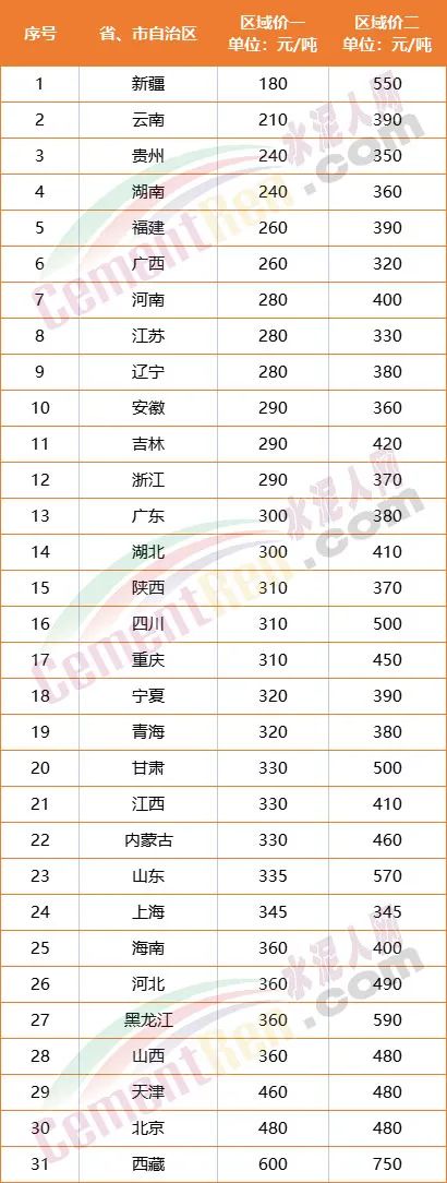 12個(gè)區(qū)域P.O42.5散裝水泥跌破300元/噸