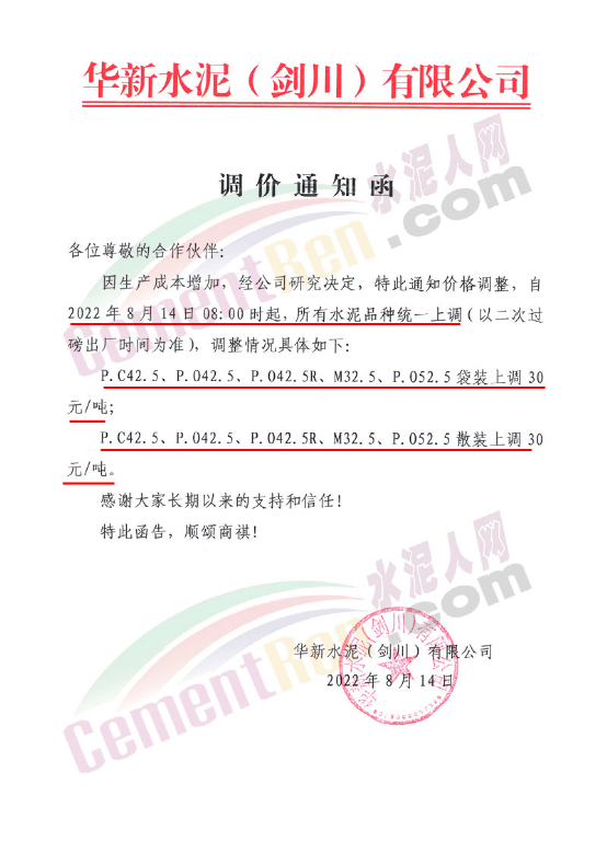 華新水泥(劍川)有限公司通知,因生產(chǎn)成本增加,經(jīng)公司研究決定自8月14日8時起,所有水泥品種統(tǒng)一上調(diào)30元/噸。