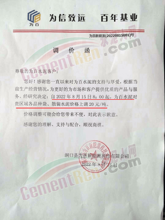 湖南洞口縣為百新能源科技有限公司通知,根據(jù)當前生產(chǎn)經(jīng)營情況,自8月15日8時起,為百水泥對各品種袋、散裝水泥價格上調(diào)20元/噸。