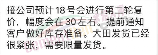 水泥銷售通知,接公司通知預(yù)計18日會進行第二輪復(fù)價,幅度會在30元/噸左右。提前通知客戶做好庫存準備,大田紅獅發(fā)貨已經(jīng)需要限量發(fā)貨。