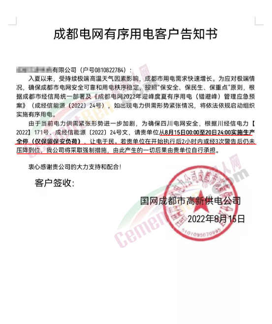 據(jù)水泥人網(wǎng)了解,國網(wǎng)成都市高新供電公司發(fā)布《成都電網(wǎng)有序用電客戶告知書》稱,入夏以來,受持續(xù)極端高溫天氣因素影響,成都市用電需求快速增長。為應(yīng)對極端情況,確保成都市電網(wǎng)安全可靠和用電秩序穩(wěn)定,按照“保安全、保民生、保重點”原則,根據(jù)成都市經(jīng)信局統(tǒng)一一部署及相關(guān)文件要求,如出現(xiàn)電力供需形勢緊張情況,將依法依規(guī)啟動組織實施有序用電。