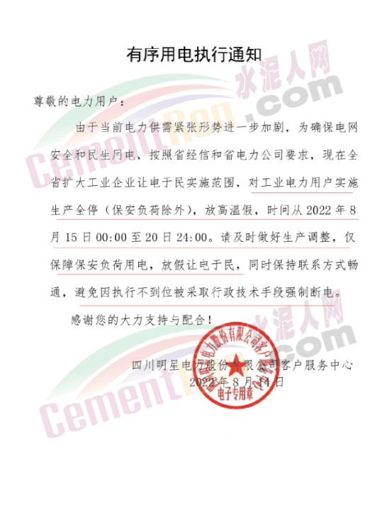 四川明星電力股份有限公司客戶服務(wù)中心發(fā)《有序用電執(zhí)行通知》給電力用戶稱,由于當前電力供需緊張形勢進一步加劇,為確保電網(wǎng)安全和民生用電,按照省經(jīng)信和省電力公司要求,現(xiàn)在全省擴大工業(yè)企業(yè)讓電于民實施范圍,對工業(yè)電力用戶實施生產(chǎn)全停(保安負荷除外),放高溫假,時間從2022年8月15日00∶00至20日24∶00。請及時做好生產(chǎn)調(diào)整,僅保障保安負荷用電,放假讓電于民,同時保持聯(lián)系方式暢通,避免因執(zhí)行不到位被采取行政技術(shù)手段強制斷電。