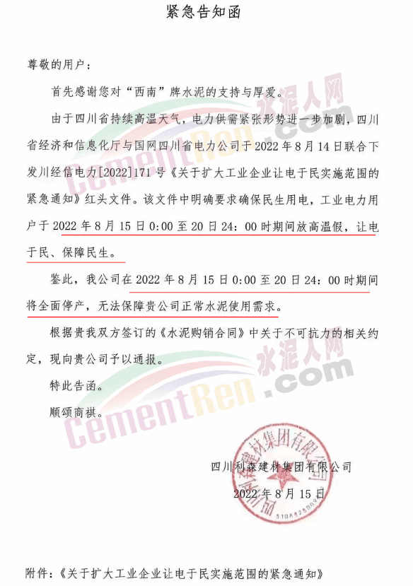 鑒此,公司在2022年8月15日0:00至20日24:00時期間將全面停產(chǎn),無法保障客戶正常水泥使用需求。根據(jù)貴我雙方簽訂的《水泥購銷合同》中關(guān)于不可抗力的相關(guān)約定,現(xiàn)向客戶予以通報。