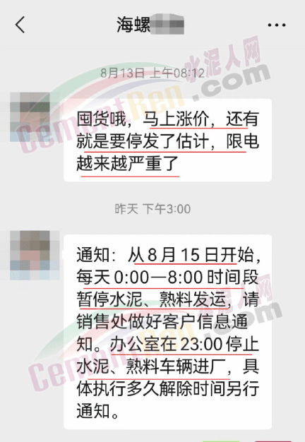海螺水泥提醒經(jīng)銷商,“囤貨哦,馬上漲價,還有就是要停發(fā)了估計,限電越來越嚴重了。”并發(fā)出通知稱:“從8月15日開始,每天0時至8時時間段暫停水泥、熟料發(fā)運,請銷售處做好客戶信息通知。辦公室在23∶00停止水泥、熟料車輛進廠,具體執(zhí)行多久解除時間另行通知。”