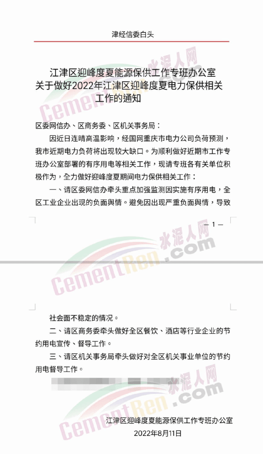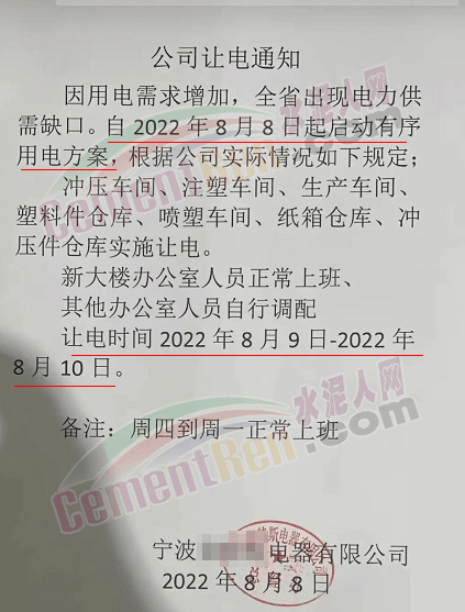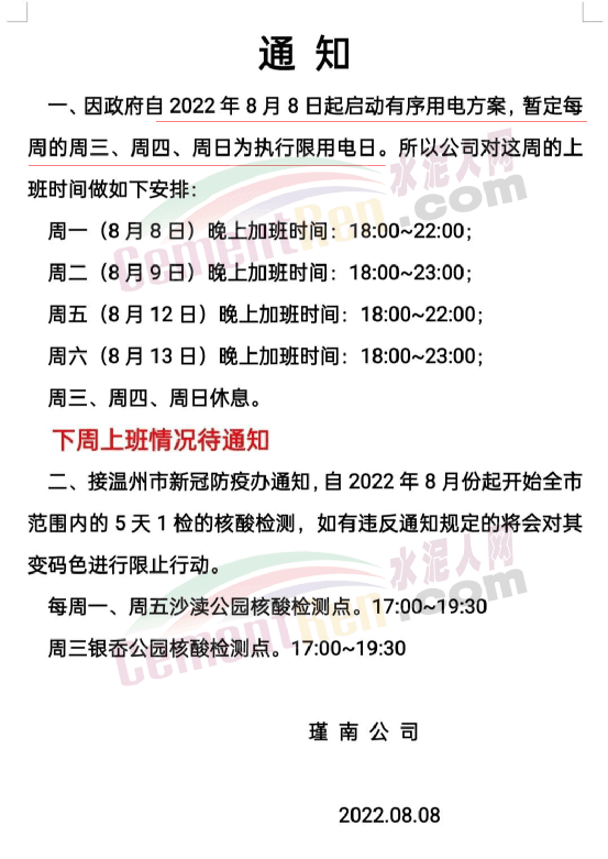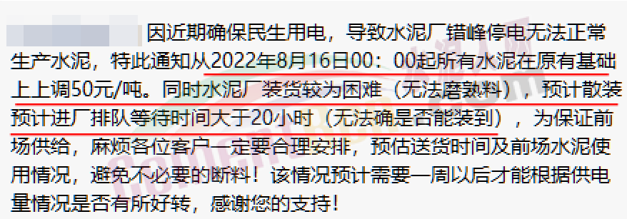 區(qū)域內(nèi)一家水泥企業(yè)緊急通知,因近期確保民生用電,導(dǎo)致水泥廠錯峰停電無法正常生產(chǎn)水泥,特此通知!從2022年8月16日00:00起所有水泥在原有基礎(chǔ)上上調(diào)50元/噸。同時水泥廠裝貨較為困難(無法磨熟料),預(yù)計散裝預(yù)計進廠排隊等待時間大于20小時(無法確是否能裝到),為保證前場供給,麻煩各位客戶一定要合理安排,預(yù)估送貨時間及前場水泥使用情況,避免不必要的斷料。該情況預(yù)計需要一周以后才能根據(jù)供電量情況是否有所好轉(zhuǎn)。