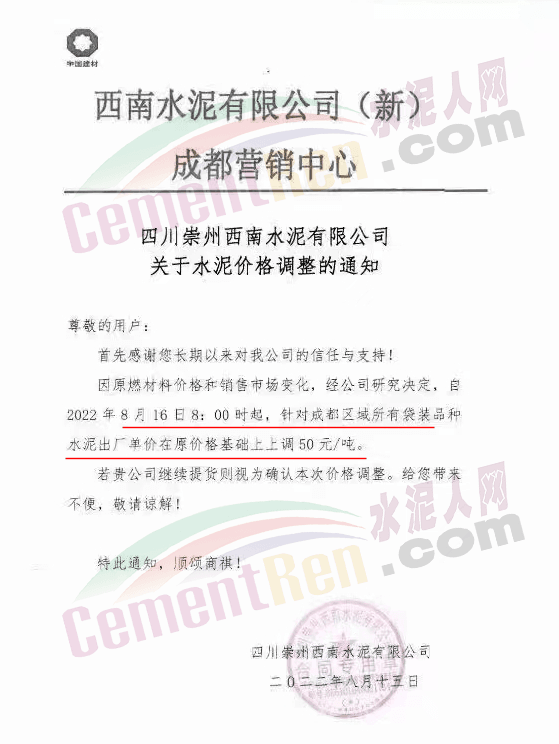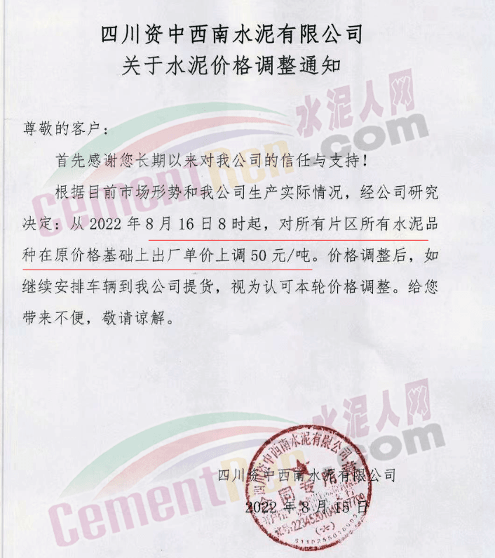 資中西南水泥通知,自8月16日8時起,對所有品種水泥價格上調(diào)50元/噸。