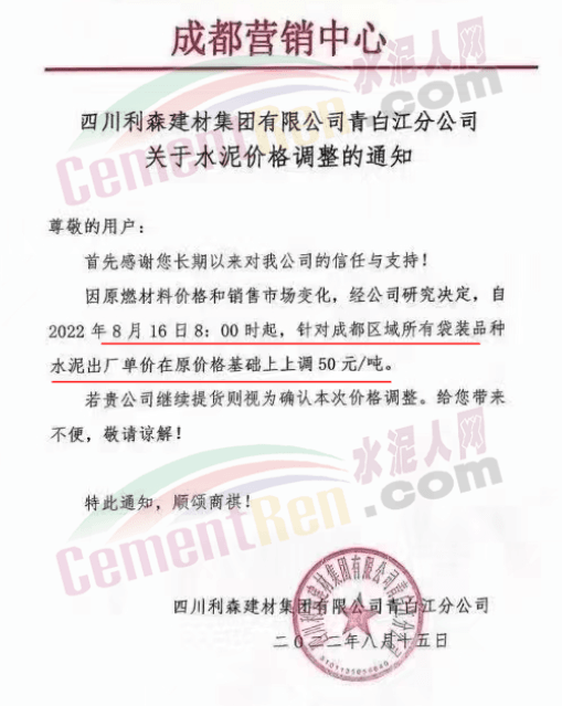 四川利森建材青白江分公司通知,8月16日8時起針對成都區(qū)域所有袋裝品種水泥出廠單價上調(diào)50元/噸。