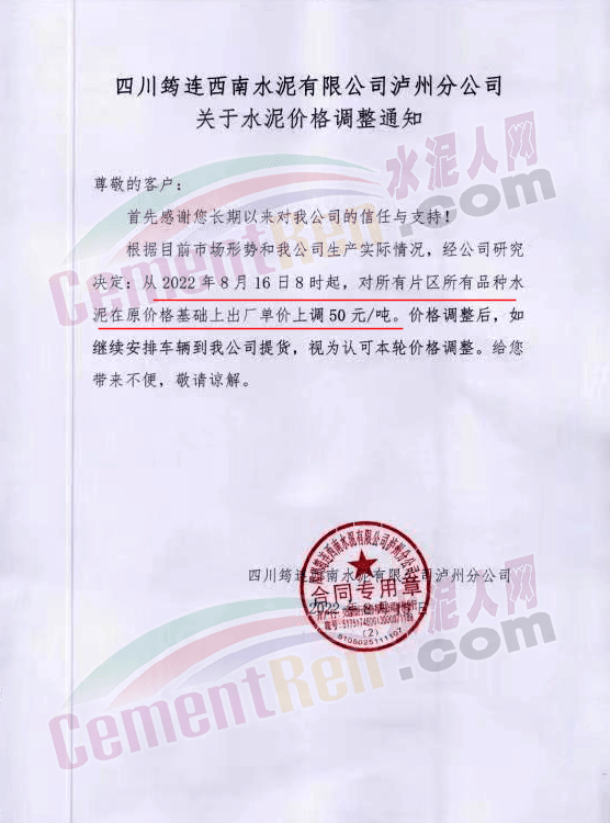 四川筠連西南水泥有限公司瀘州分公司通知,根據(jù)目前市場形勢和我公司生產(chǎn)實際情況,經(jīng)公司研究決定,從2022年8月16日8時起,對所有片區(qū)所有品種水泥在原價格基礎(chǔ)上出廠單價上調(diào)50元/噸。價格調(diào)整后,如繼續(xù)安排車輛到我公司提貨,視為認可本輪價格調(diào)整。