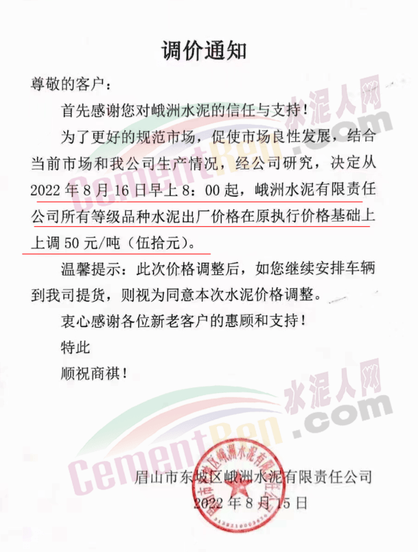 峨洲水泥通知自8月16日早8時起,所有等級品種水泥價格上調(diào)50元/噸。
