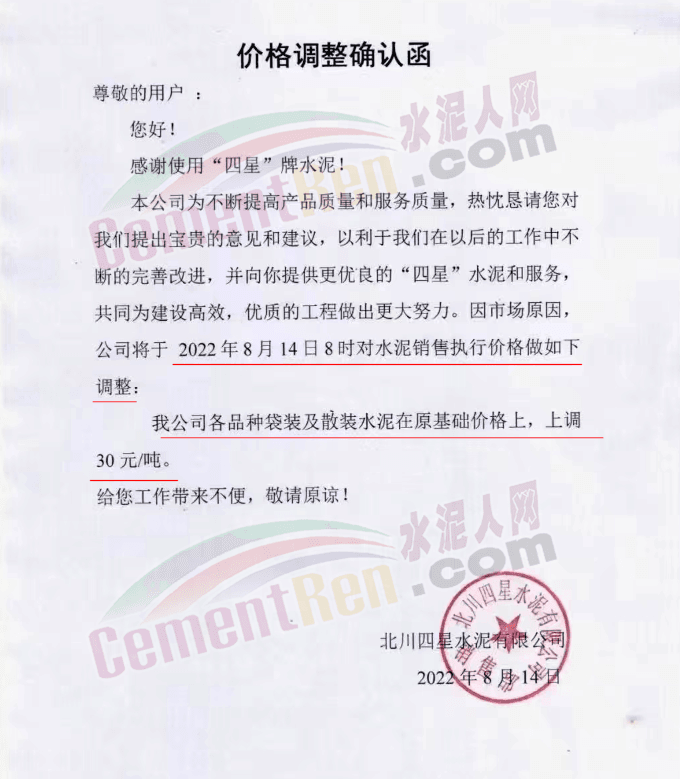 江油紅獅銷售服務(wù)科通知,根據(jù)當前市場行情,經(jīng)公司研究決定,自2022年8月15日上午7時起,江油紅獅生產(chǎn)的各規(guī)格水泥上調(diào)30元/噸。價格調(diào)整后,如您繼續(xù)安排車輛到我公司提貨,視為確認本次價格調(diào)整。