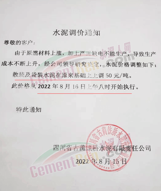 四川古藺鐵橋水泥通知,8月16日上午8時起,水泥價格上調(diào)50元/噸。