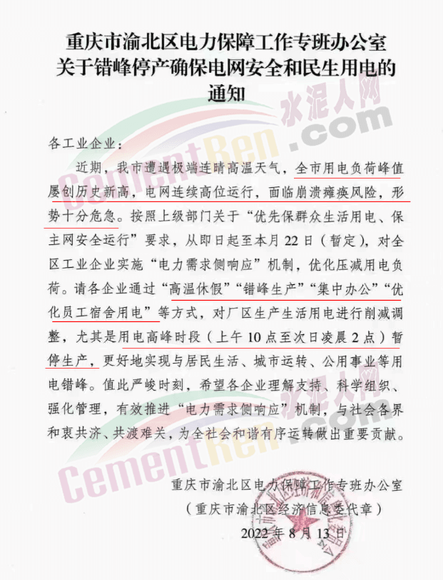 重慶市渝北區(qū)電力保障工作專班辦公室發(fā)布《關(guān)于錯峰停產(chǎn)確保電網(wǎng)安全和民生用電的通知》給各工業(yè)企業(yè)稱,近期,重慶市遭遇極端連晴高溫天氣,全市用電負荷峰值屢創(chuàng)歷史新高,電網(wǎng)連續(xù)高位運行,面臨崩潰癱瘓風(fēng)險,形勢十分危急。按照上級部門關(guān)于“優(yōu)先保群眾生活用電、保主網(wǎng)安全運行”要求,從即日起至本月22日(暫定),對全區(qū)工業(yè)企業(yè)實施“電力需求側(cè)響應(yīng)”機制,優(yōu)化壓減用電負荷。請各企業(yè)通過“高溫休假”“錯峰生產(chǎn)”“集中辦公”“優(yōu)化員工宿舍用電”等方式,對廠區(qū)生產(chǎn)生活用電進行削減調(diào)整,尤其是用電高峰時段(上午10點至次日凌晨2點)暫停生產(chǎn),更好地實現(xiàn)與居民生活、城市運轉(zhuǎn)、公用事業(yè)等用電錯峰。