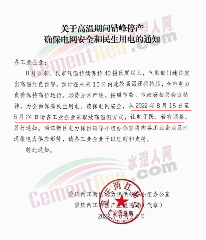 重慶兩江新區(qū)《關(guān)于高溫期間錯峰停產(chǎn)確保電網(wǎng)安全和民生用電的通知》稱,8月以來,我市氣溫持續(xù)保持40攝氏度以上,氣象部門連續(xù)發(fā)出高溫紅色預(yù)警。預(yù)計在未來10日內(nèi)此輪高溫還將持續(xù),全市電力負荷保持高位運行,形勢異常嚴峻。按照市委、市政府相關(guān)會議精神,為全面保障民生用電,確保電網(wǎng)安全,從2022年8月15日至8月24日請各工業(yè)企業(yè)采取放高溫假方式,讓電于民,若有調(diào)整,另行通知。兩江新區(qū)電力保供領(lǐng)導(dǎo)小組辦公室將向各工業(yè)企業(yè)及時通報電力供應(yīng)形勢,請各工業(yè)企業(yè)予以理解和支持。