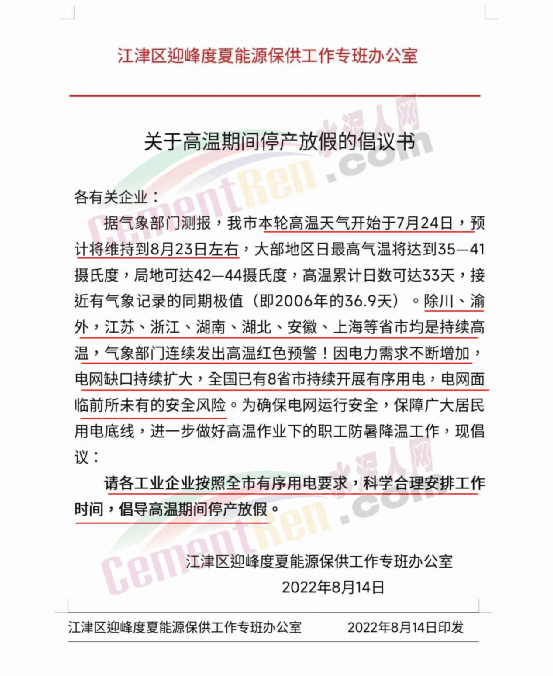重慶江津區(qū)迎峰度夏能源保供工作專班辦公室發(fā)布《關(guān)于高溫期間停產(chǎn)放假的倡議書》給各有關(guān)企業(yè)稱∶據(jù)氣象部門測報,重慶市本輪高溫天氣開始于7月24日,預(yù)計將維持到8月23日左右,大部地區(qū)日最高氣溫將達到35—41 攝氏度,局地可達42——44攝氏度,高溫累計日數(shù)可達33天,接近有氣象記錄的同期極值(即2006年的36.9天)。