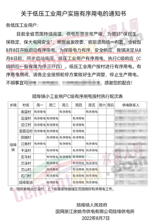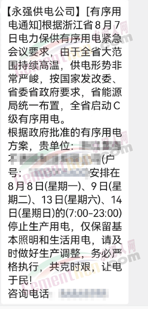 8月初,浙江省發(fā)改委發(fā)布《關(guān)于同意啟動C級有序用電的函》給國網(wǎng)浙江電力有限公司稱,經(jīng)請示省政府同意,浙江省8月8日根據(jù)用電缺口實際情況啟動C級1250萬千瓦有序用電措施,8月9日再視情況調(diào)整有序用電等級。請認真做好有序用電細化措施,壓實各地責(zé)任,確保民生用電,絕不能拉閘限電。
