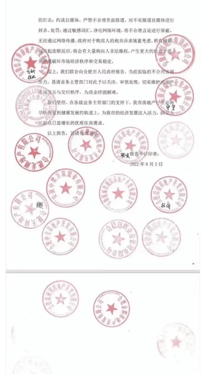 近日,一份寫給合肥市政府的、名為《關(guān)于請求維護營商環(huán)境、增強房企投資信心的紓困解難報告》的文件流出,落款處蓋著保利、華潤、綠城、龍湖、融創(chuàng)、旭輝和葛洲壩等17家品牌房企的印章。報告請求合肥政府:堅決遏制專業(yè)房鬧及種種“惡意維權(quán)”行為。
