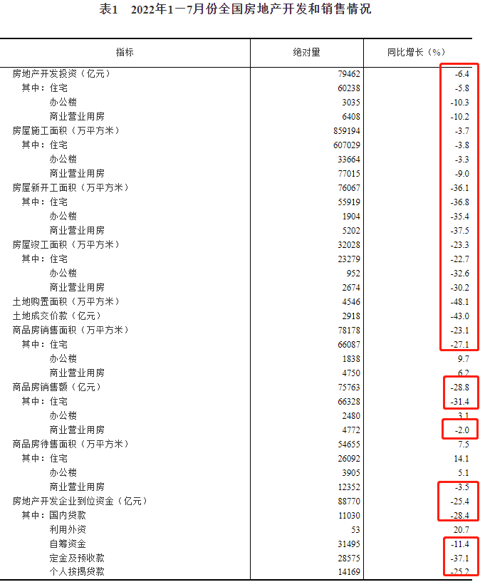 2022年下半年已開啟,全國樓市仍處于艱難尋底中,且下行態(tài)勢嚴峻。近日國家統(tǒng)計局發(fā)布7月份房地產(chǎn)相關(guān)數(shù)據(jù),所有指標全部下跌。