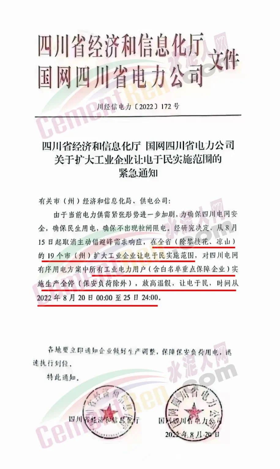 四川發(fā)文,要求除攀枝花、涼山的19個市(州)擴(kuò)大工業(yè)企業(yè)讓電于民實施范圍,對四川電網(wǎng)有序用電方案中所有工業(yè)電力用戶(合白名單重點保障企業(yè))實施生產(chǎn)全停(保安負(fù)荷除外),放高溫假,讓電于民,時間從2022年8月20日00∶00至25日24∶00。