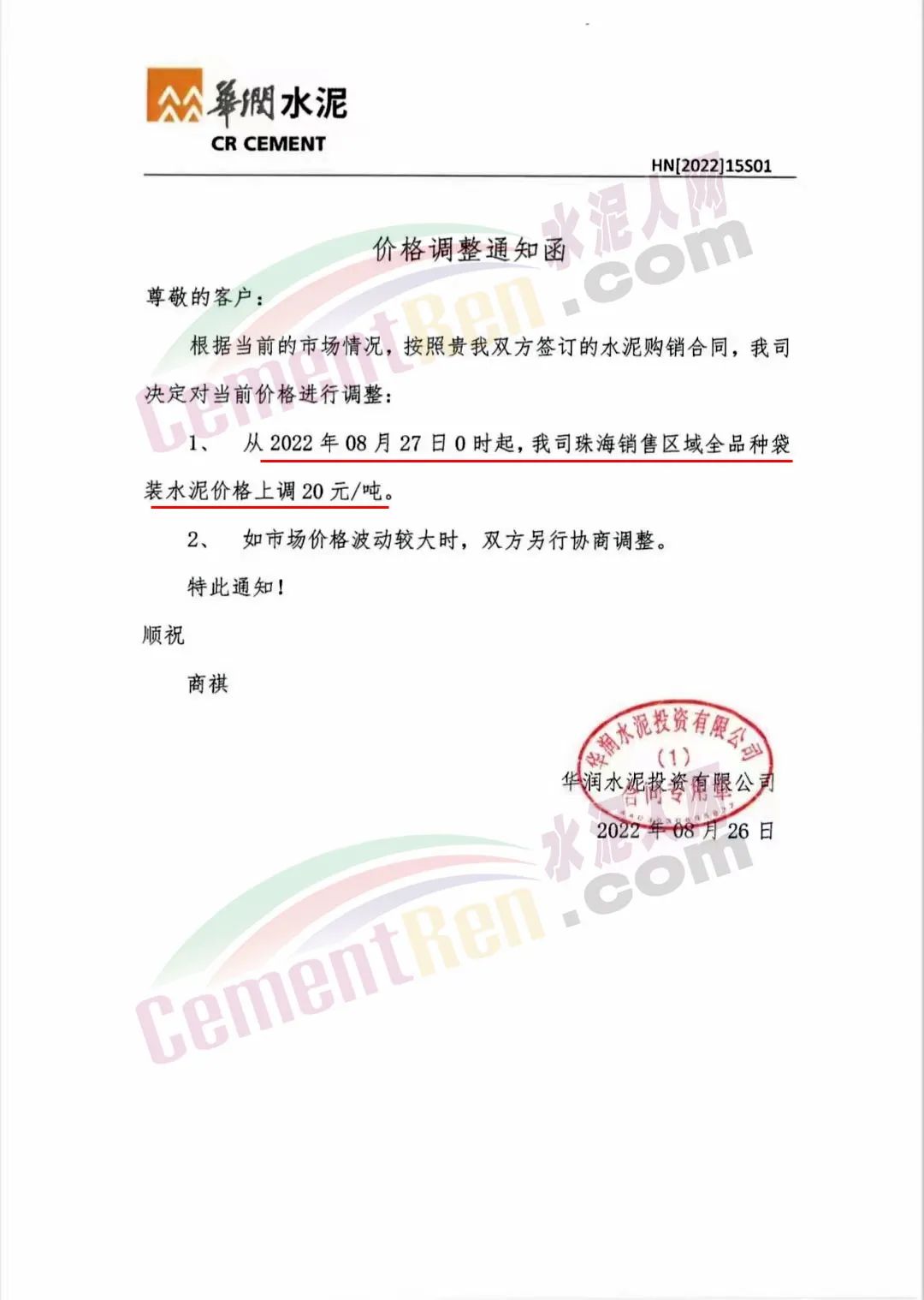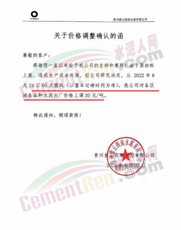 水泥人網(wǎng)通訊員消息,華潤水泥投資有限公司通知,8月27日0時起,公司珠海銷售區(qū)域全品種袋裝水泥價格上調20元/噸。