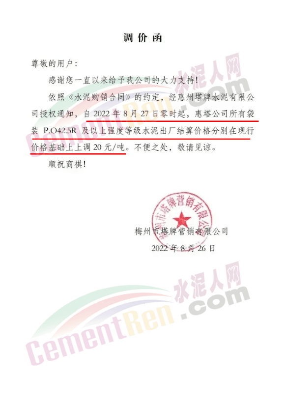 梅州市塔牌營銷有限公司通知自8月27日零時起,惠塔公司所有袋裝P.O42.5R及以上強度等級水泥出廠結算價格分別在現(xiàn)行價格基礎上上調20元/噸。