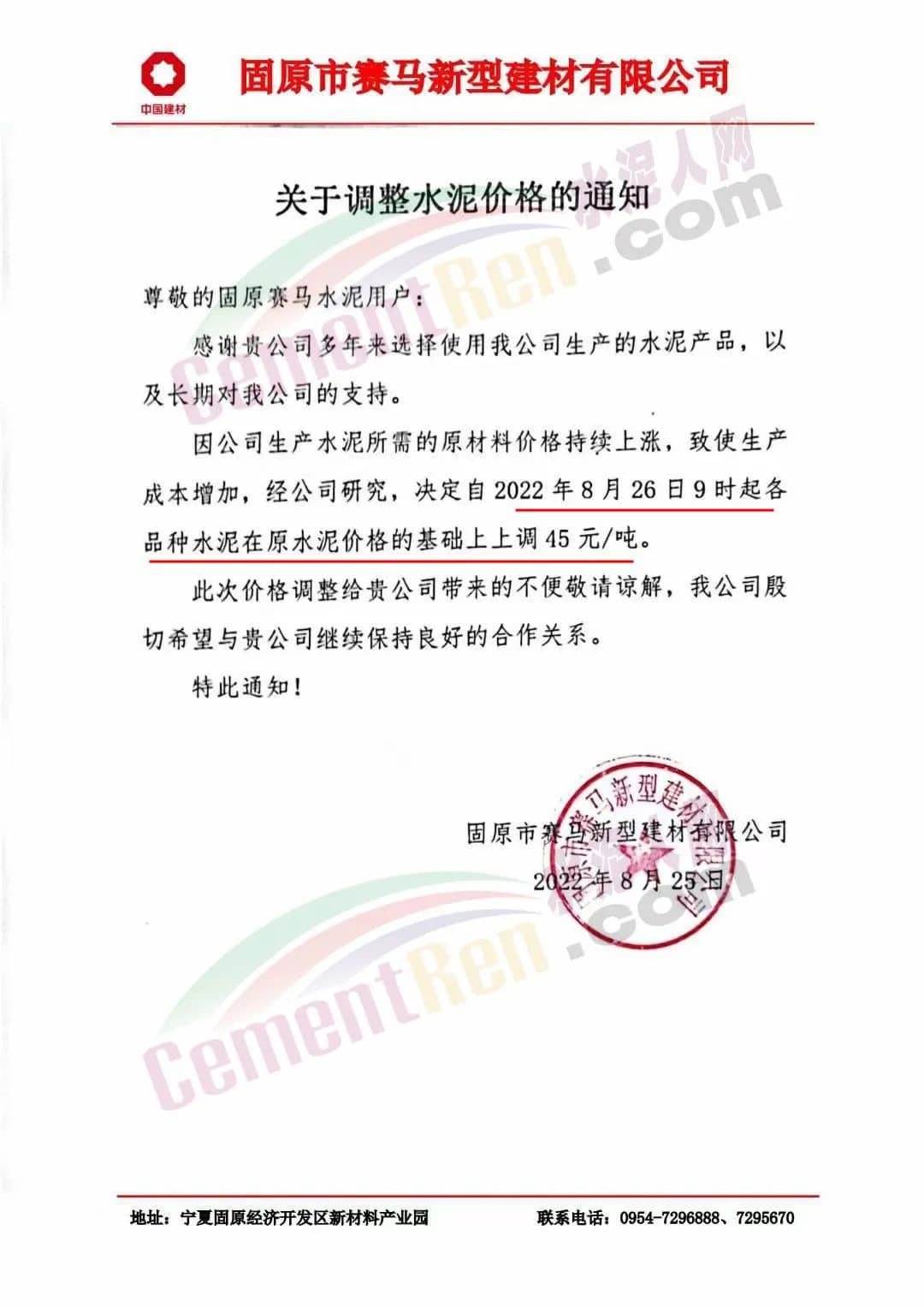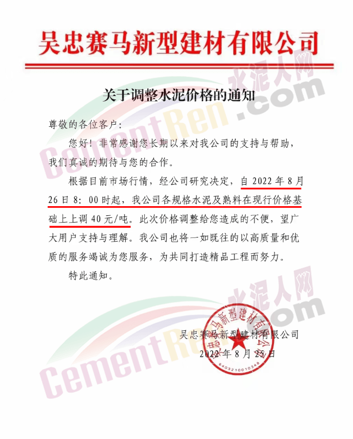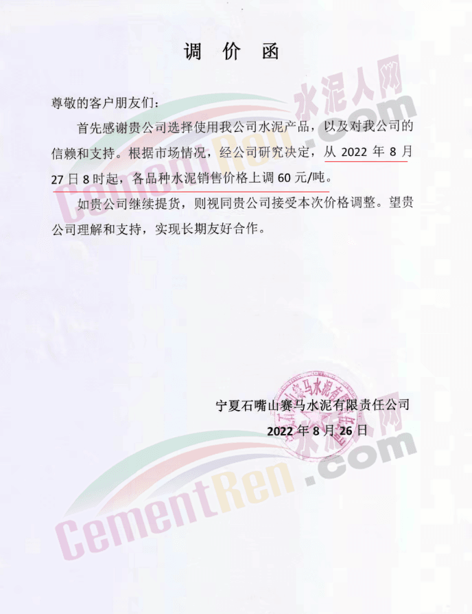 寧夏石嘴山賽馬水泥有限責任公司通知8月27日8時起,各品種水泥銷售價格上調60元/噸。