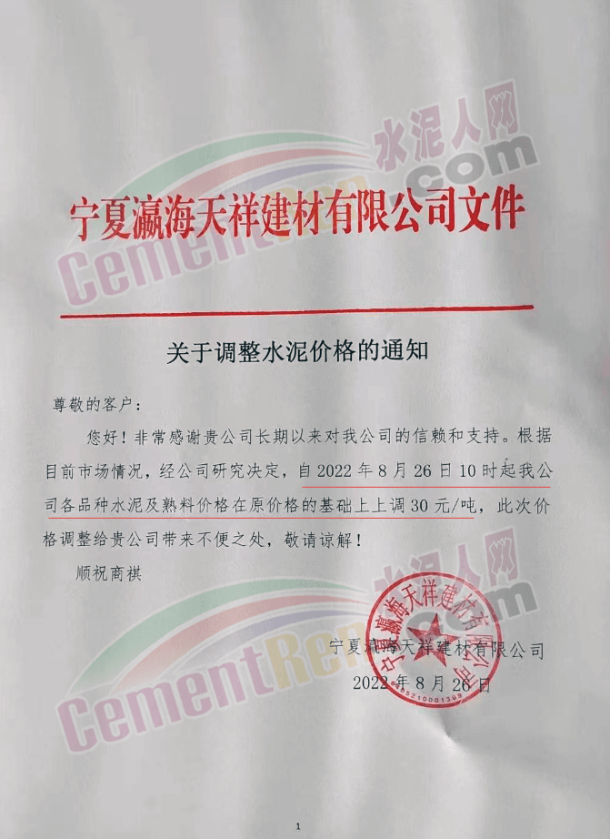 寧夏瀛海天祥建材有限公司通知自8月26日10時起公司各品種水泥及熟料價格在原基礎上上調30元/噸。