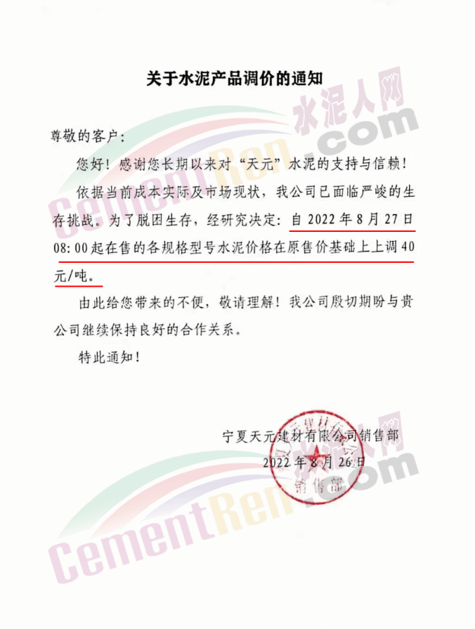 寧夏天元建材有限公司銷售部通知,自8月27日起上調水泥價格40元/噸。
