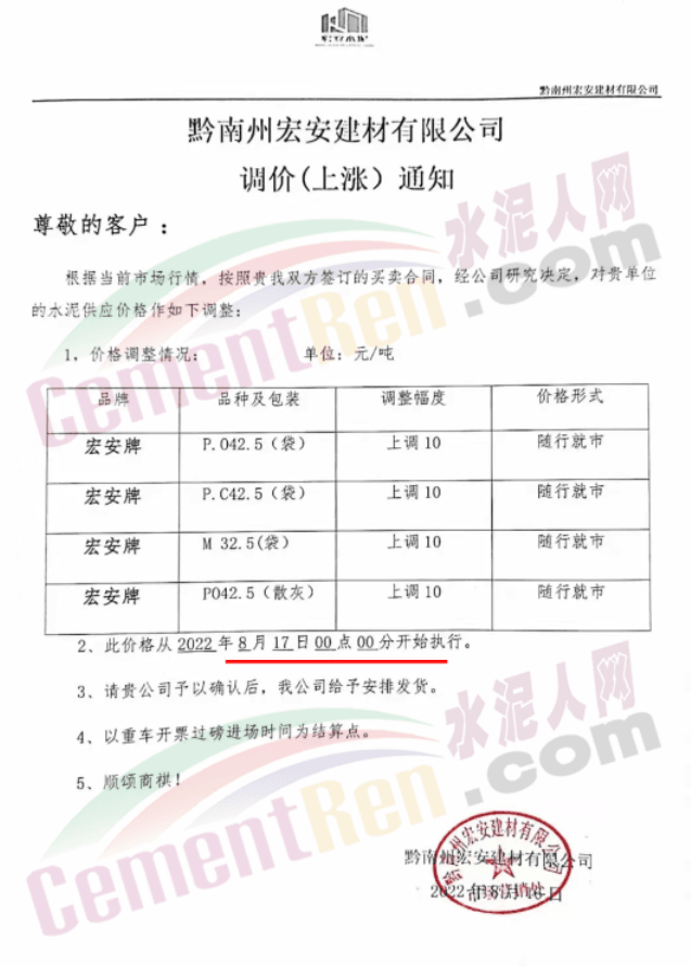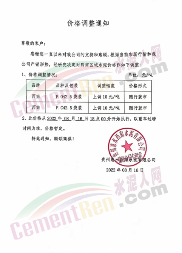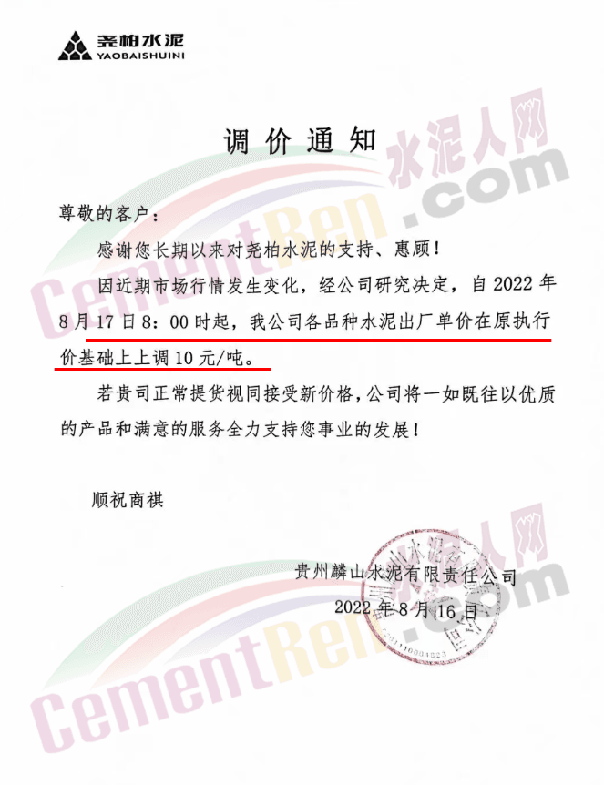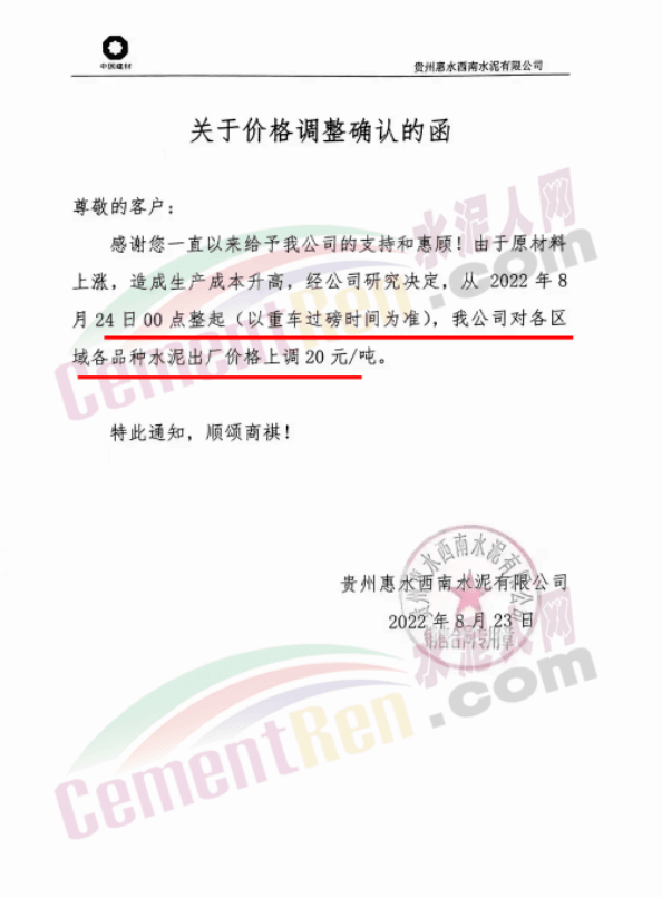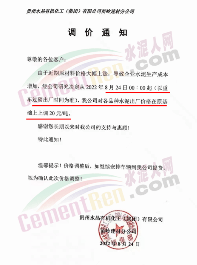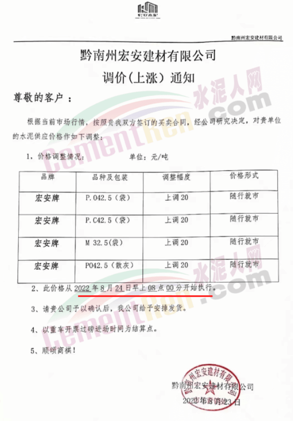 貴州余慶東立水泥通知,自8月27日8時起,公司多品牌水泥在原價基礎上上調30元/噸。
