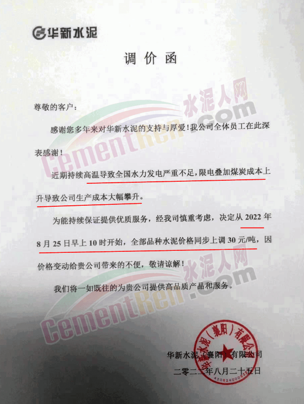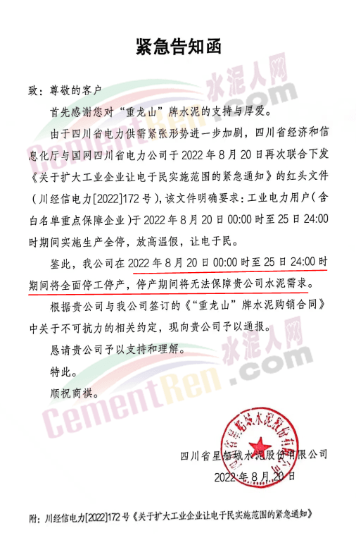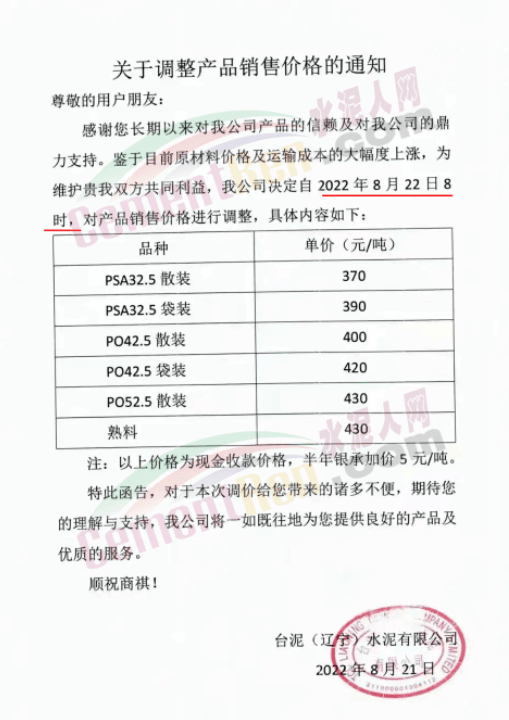 因不可抗力原因,企業(yè)停產。川渝區(qū)域主要品牌企業(yè)西南水泥、金隅冀東、雙馬水泥等繼前期18日-20日推漲50-60元/噸后,再次通知于8月23日-24上調水泥價格50元/噸。