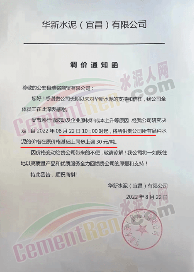 華新水泥(宜昌)有限公司22日上調30元/噸。