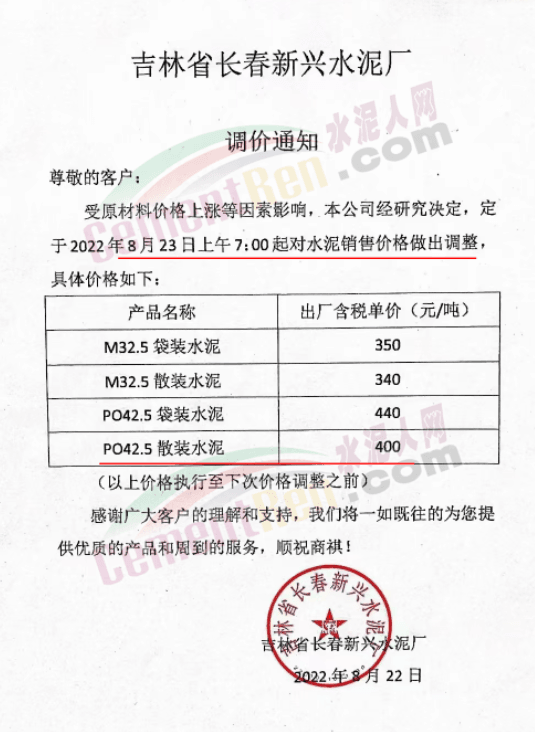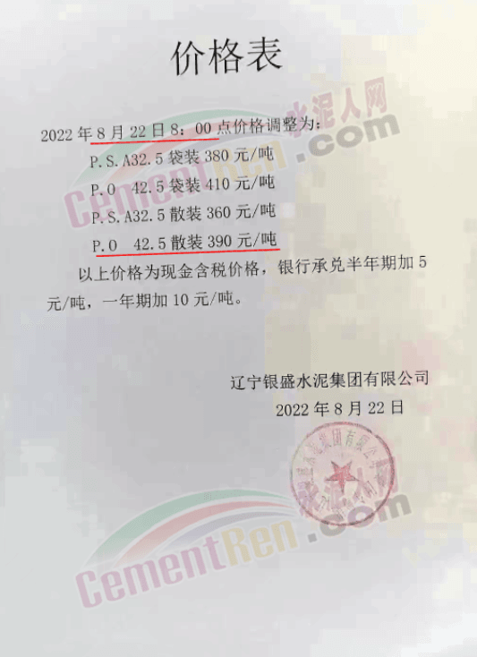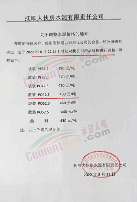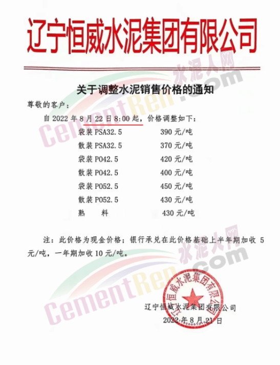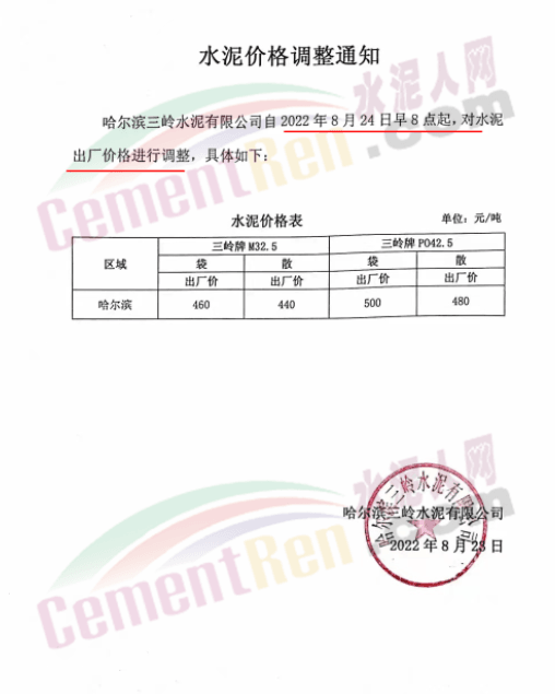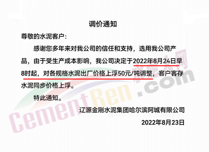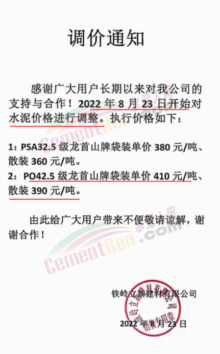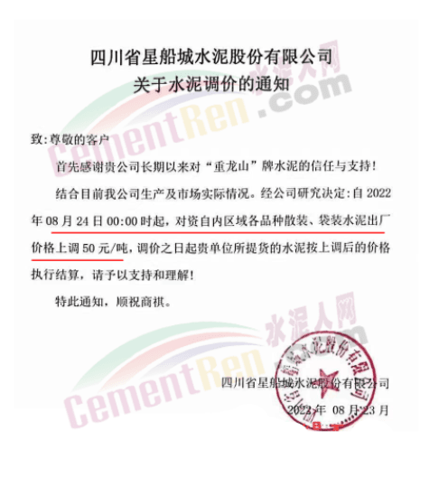 寧夏上峰萌生建材有限公司通知各品種水泥價格自8月26日早8時起在原有基礎上上調50元/噸。