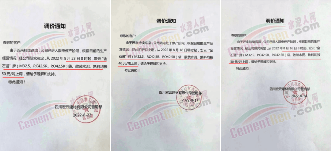 四川宏云建材有限公司營銷部通所有水泥及熟料分別于本月16日漲30元/噸、18日漲40元/噸、23日漲50元/噸,累計漲價達120元/噸。