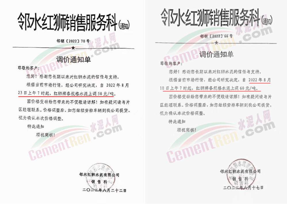 鄰水紅獅銷售服務科通知,紅獅牌各規(guī)格水泥分別于8月1日漲30元/噸、16日漲40元/噸、18日漲60元/噸、23日漲50元/噸,4次累計上漲達180元/噸。