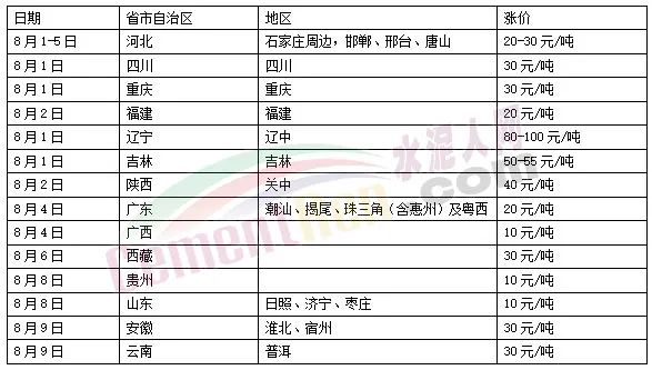 據(jù)水泥人網(wǎng)不完全統(tǒng)計7月中旬至8月初江蘇、浙江、上海、安徽、河南、山東、河北、福建、遼寧、吉林、陜西、重慶、四川、貴州、廣西等20多個區(qū)域水泥價格通知上調(diào)。進入8月中旬,發(fā)布漲價函的區(qū)域進一步擴大至青海、寧夏、內(nèi)蒙、黑龍江、湖北、北京、天津等30多個區(qū)域。