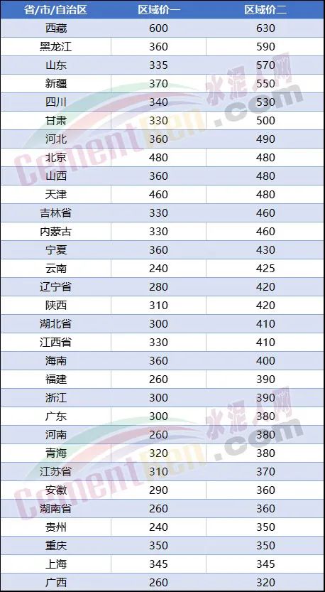 水泥人網(wǎng)信息中心數(shù)據(jù)顯示,目前市場較高價(jià)格仍在西藏、黑龍江、山東、四川、甘肅、河北、吉林等主要品牌企業(yè)占比權(quán)重相對較高的的區(qū)域。