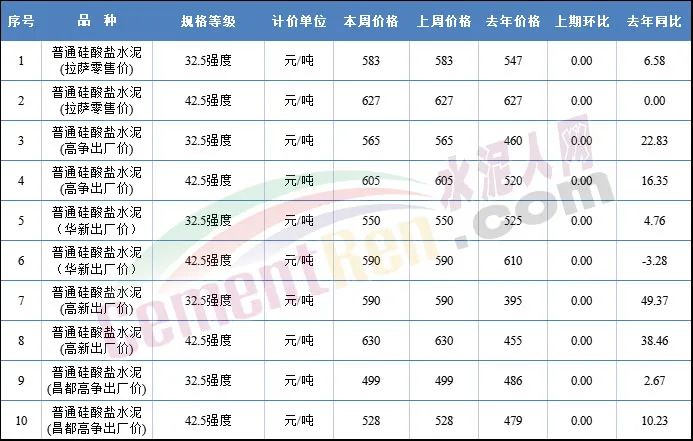 拉薩市主要建材價(jià)格監(jiān)測表(第37周)