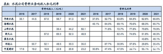 骨料資源屬性帶來高盈利壁壘,區(qū)域間有明顯分化。一方面,2016~2019年由于環(huán)保等因素關(guān)停大量小礦山,在淘汰落后產(chǎn)能的同時、新增產(chǎn)能補充不及時,礦山數(shù)量和砂石產(chǎn)量明顯減少,造成骨料供需短期失衡,價格大幅上漲。全國砂石骨料均價從2016年的46元/噸漲至2020年的100元/噸以上。海螺水泥骨料毛利率從2016年的46%升至2021年的68.34%;華新骨料業(yè)務(wù)毛利率從2016年的37.5%上漲至2021年的65.6%;上峰水泥2021年砂石骨料毛利率高達79.92%……