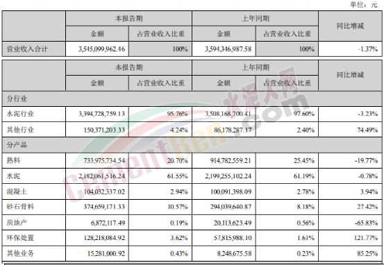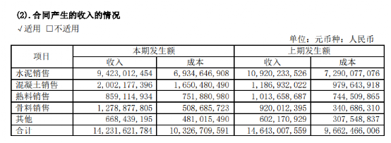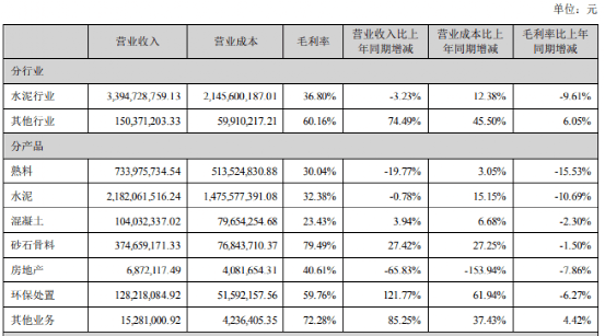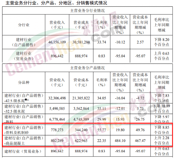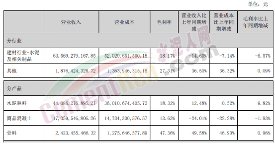 報告期內(nèi),42.5級水泥毛利率同比上升2.03個百分點,32.5級水泥毛利率同比下降1.84個百分點,熟料毛利率同比上升6.72個百分點;其中集團自產(chǎn)品42.5級水泥毛利率、32.5級水泥毛利率、熟料毛利率同比分別下降7.83個百分點、10.89個百分點、5.97個百分點。骨料及機制砂綜合毛利率為55.77%,同比下降8.85個百分點;商品混凝土綜合毛利率22.35%,同比上升2.28個百分點。