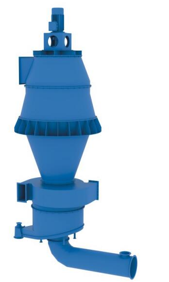 粉磨后的物料喂入選粉機的進料口,在一次風(fēng)作用下分散并隨氣流流向?qū)蛉~片和轉(zhuǎn)子間,物料在旋轉(zhuǎn)氣流中進行分選。分選主要是依據(jù)離心力與旋轉(zhuǎn)氣流的向心力的平衡,達到有效的分級;二次風(fēng)口是氣流分散裝置的進風(fēng)口,粗顆粒向下運動落入氣流分散裝置,到導(dǎo)葉片處被進入的二次風(fēng)吹散、分選;繼續(xù)向下流動的粗顆粒經(jīng)灰斗處時再受進入的三次空氣的再一次分選,使之進一步除去混在粗粉中的細粉,最后選下的粗粉經(jīng)粗粉出料口排出。細粉通過轉(zhuǎn)子中心和空氣一起由彎管排出,經(jīng)收塵器收集成為成品。