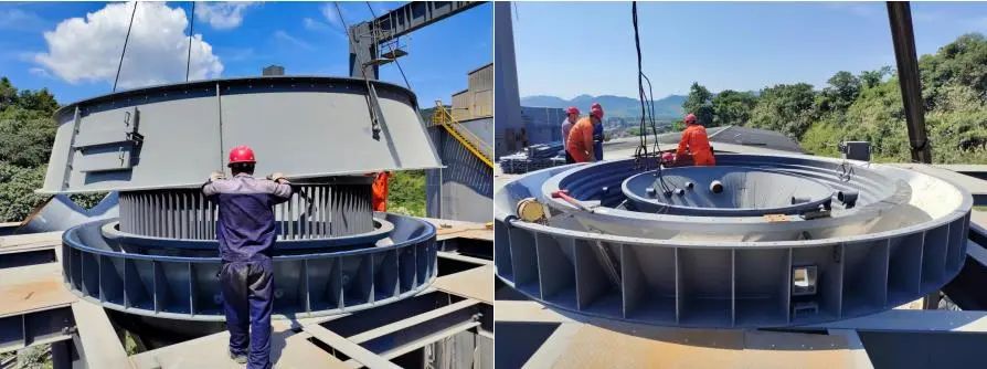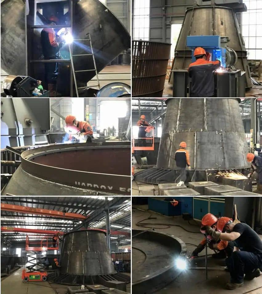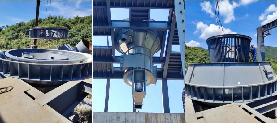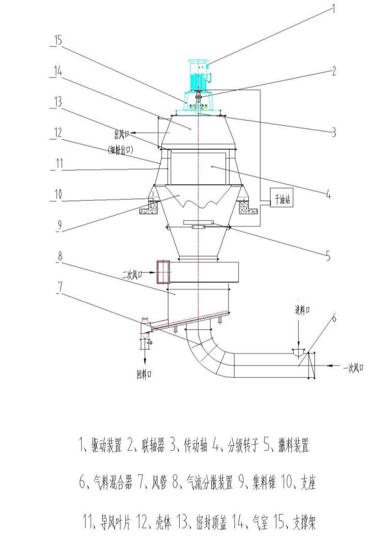 本機含有殼體、分級轉(zhuǎn)子、撒料裝置、驅(qū)動裝置、傳動軸等部件。殼體部分由上、下錐體、密封頂蓋灰等組成。在殼體裝有支撐板、導(dǎo)向葉片、空氣密封圈。殼體側(cè)面與頂蓋開設(shè)有檢查門。殼體上部承受選粉機主軸所聯(lián)結(jié)的電動機、減速器、支座等重量。