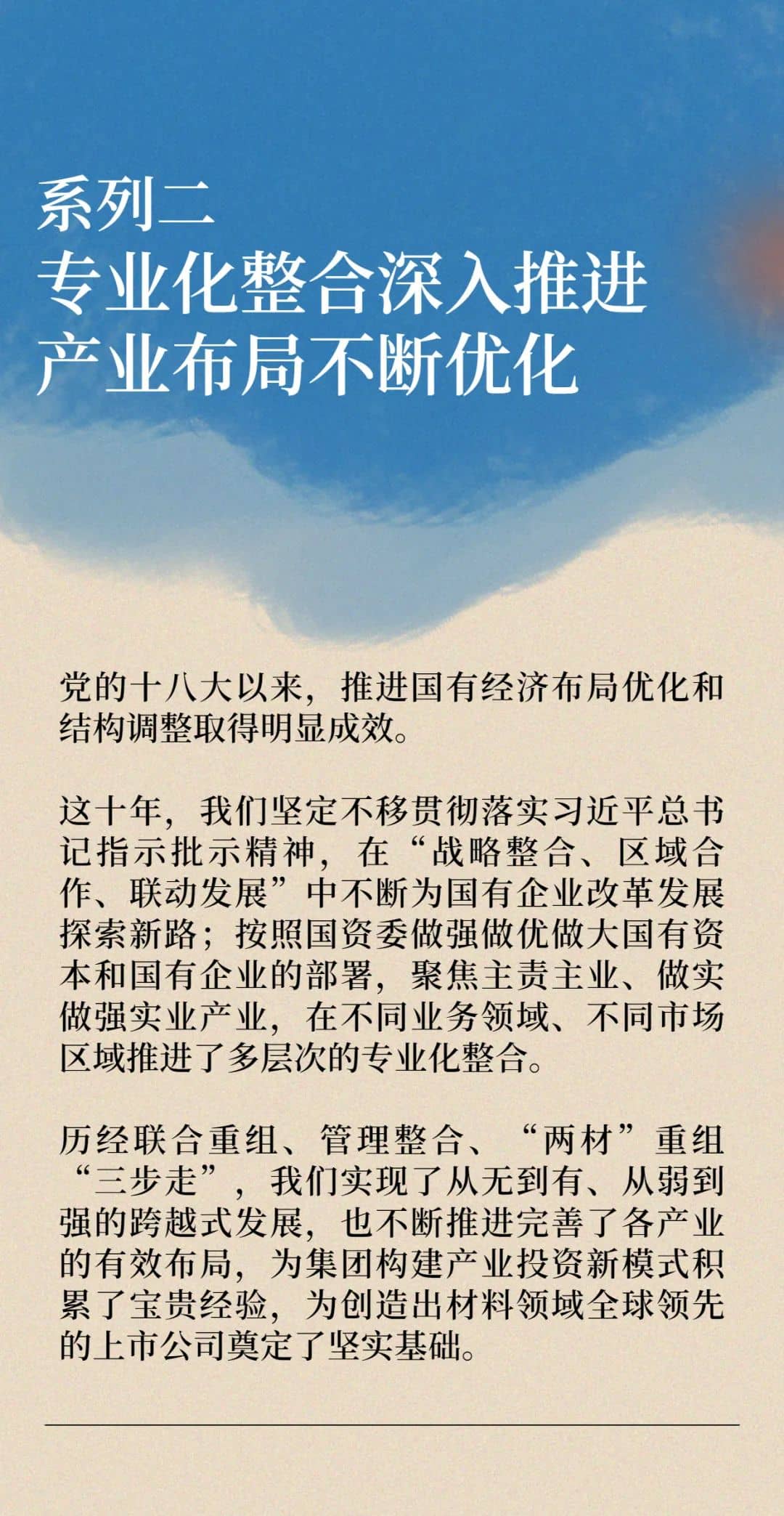 自2016年“兩材”重組以來,我們聚焦國(guó)有資本流動(dòng)增值和高質(zhì)量發(fā)展,在集團(tuán)范圍內(nèi)開展了多項(xiàng)專業(yè)化整合,以打造邊界清晰、主業(yè)精銳、具有產(chǎn)業(yè)鏈控制力的主產(chǎn)業(yè)平臺(tái)。