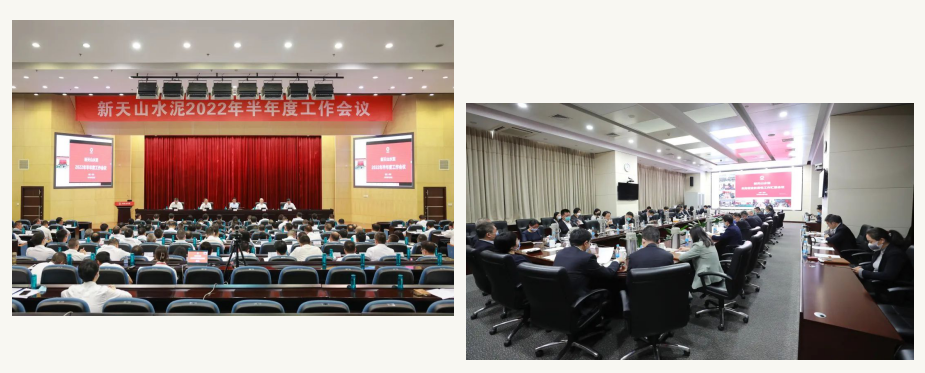 左圖為新天山水泥2022年半年度工作會(huì)議,右圖為新天山水泥業(yè)務(wù)整合階段性工作匯報(bào)會(huì)議。