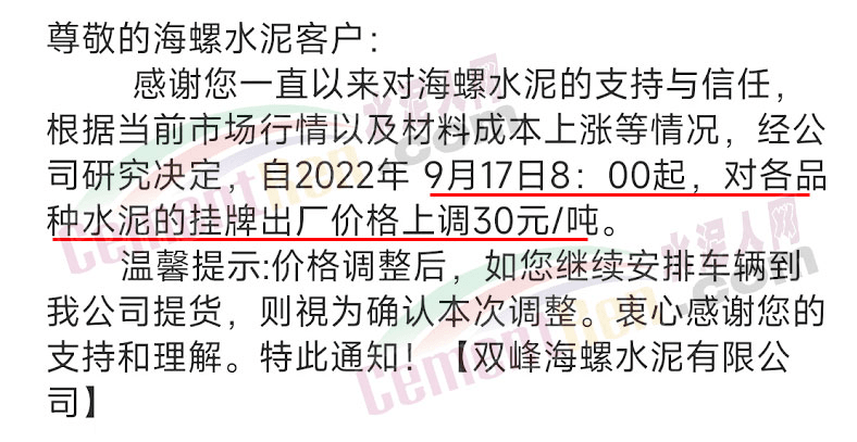 湖南雙峰海螺通知,9月17日8時起,對各品種水泥掛牌出廠價上調(diào)30元/噸。